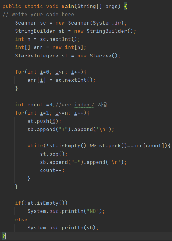 스택이 비어있지 않고 스택의 peek 가(맨 위) arr[count]와 일치한다면 pop !