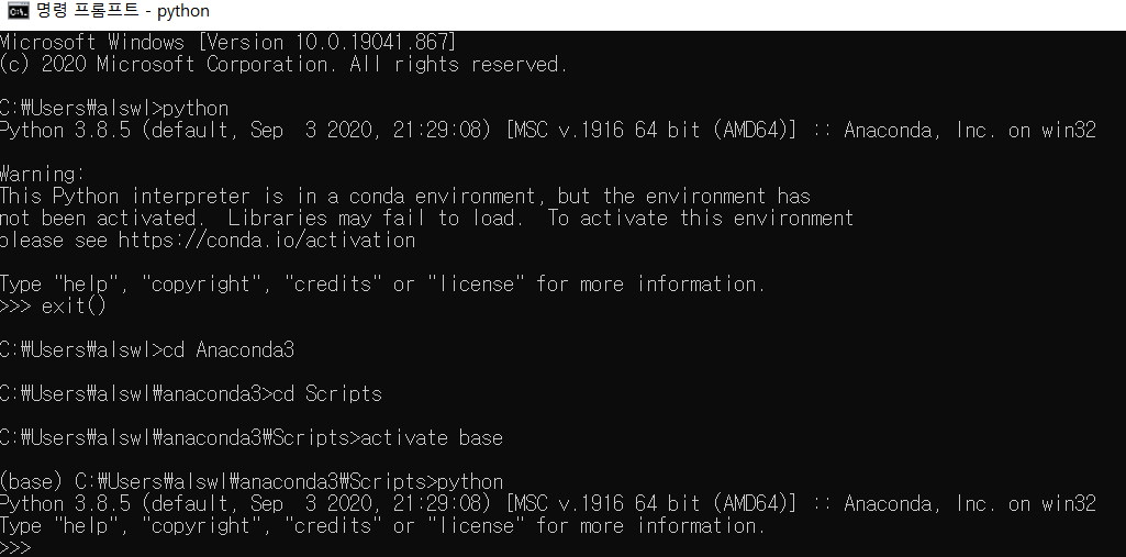 구글링 결과 Anaconda3/Scripts에서 acvtivate base 명령어를 쳐주어야 한다고 한다.